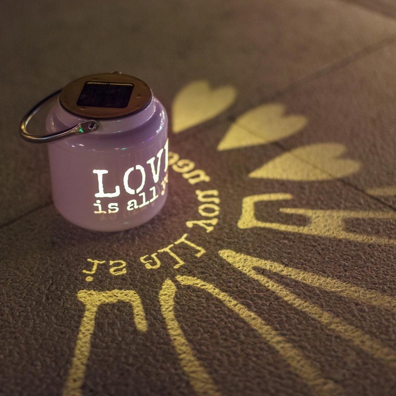 Lampe lumineuse jeux d'ombres SWEET Lumisky®Love is all you need !! C'est le beau message de la lanterne SWEET. Elle sera sans conteste la touche finale de votre décoration d'intérieur. Cette lampe propose une lumière décorative, jouant avec les ombres. Proposant une autonomie de 8 heures, la lanterne SWEET avec la norme IP44 vous garantit une résistance aux éclaboussures et projections d'eau. Complètement autonome en énergie grâce à son panneau solaire situé sur la partie supérieure, il vous suffira de la placer à la lumière du soleil pour la recharger. ![]()